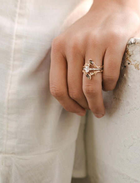 Atlantic Leaf Scrolls Labradorite and Diamond Yellow Gold Stacking Ring